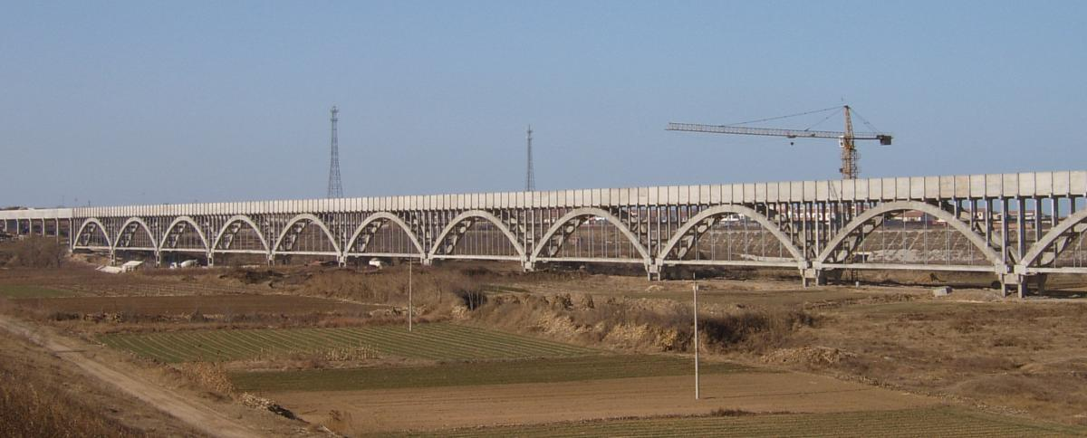 山东省胶东地区引黄调水工程淘金河渡槽:全长1373米,最大跨度50.6米。采用上承式预应力砼拉杆拱式矩形渡槽、简支梁式预应力砼矩形渡槽和简支梁式普通钢筋砼矩形渡槽等三种结构形式,设计输水流量16.3立方米/秒。